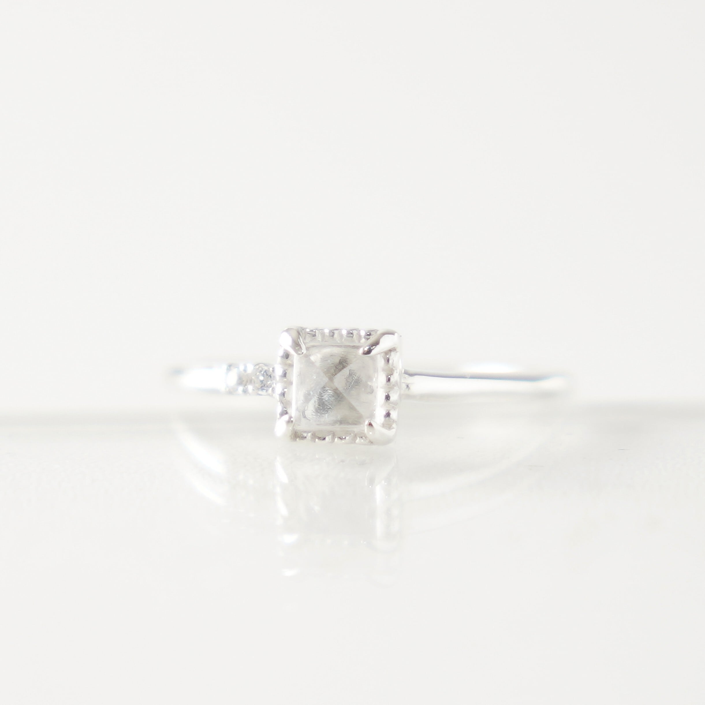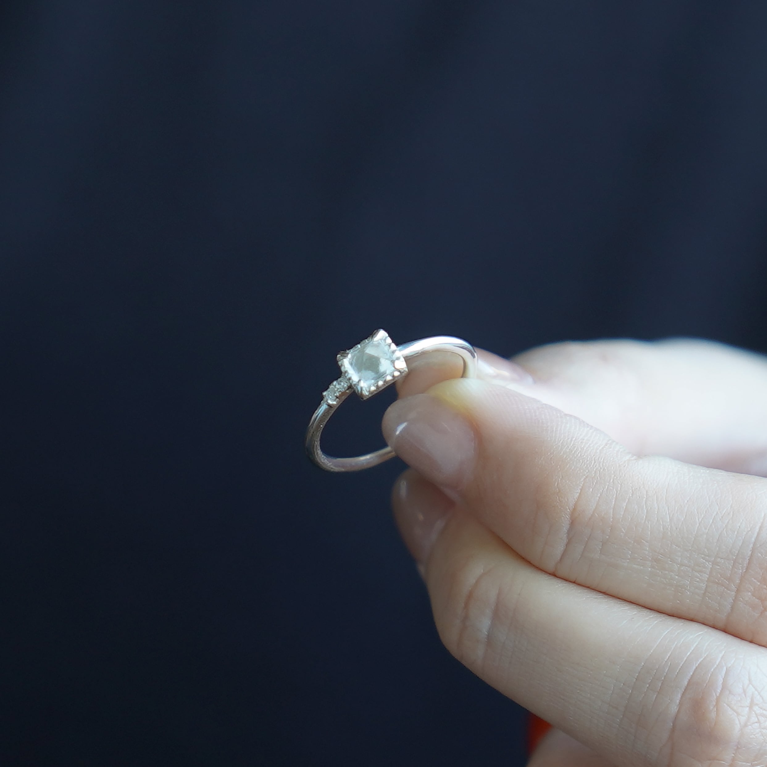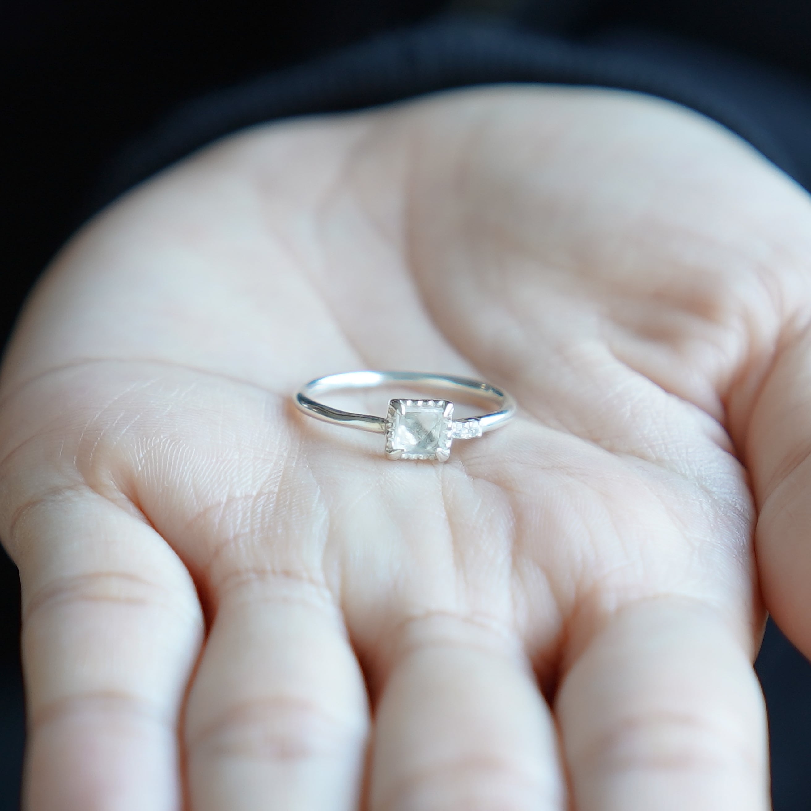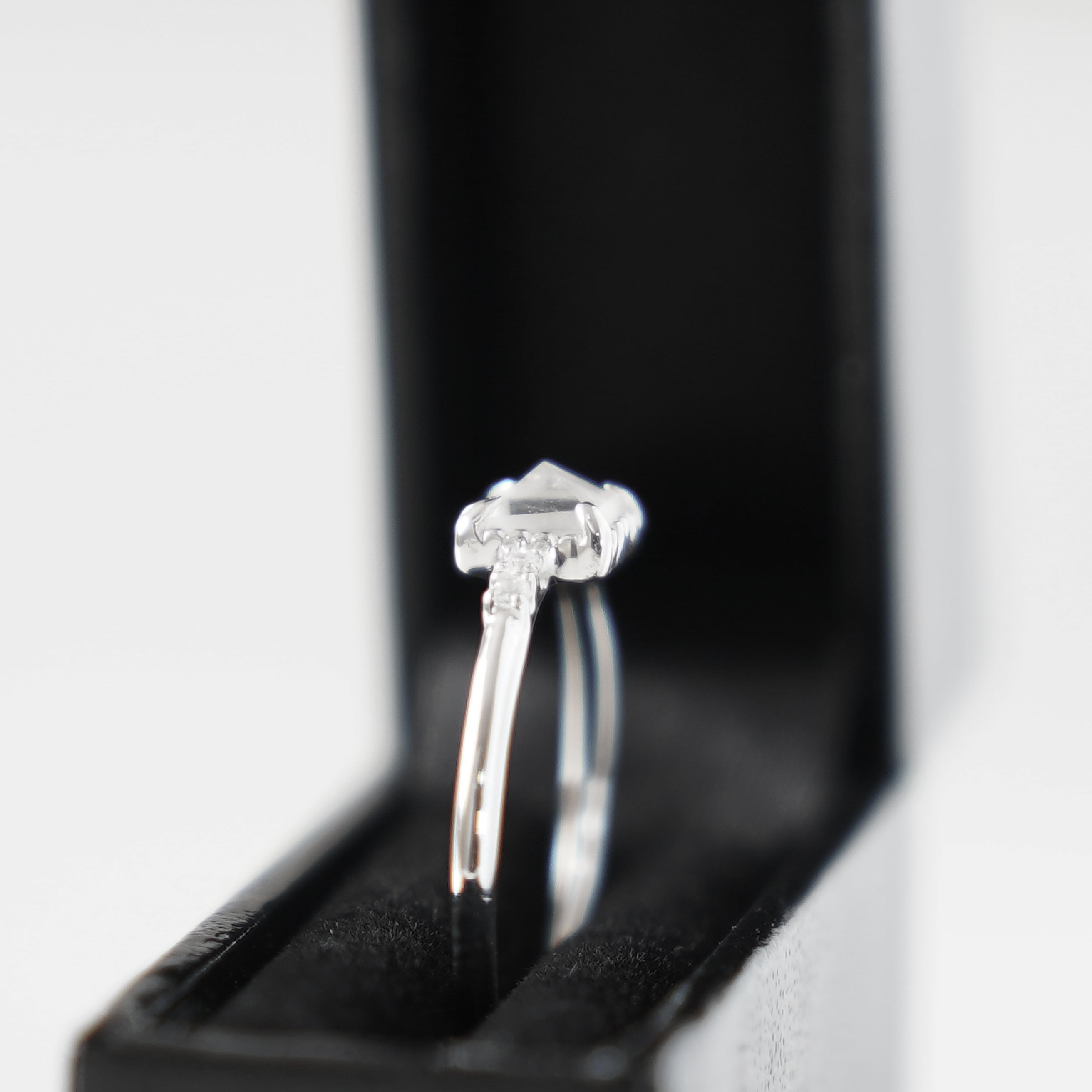 小さな水晶のピラミッドの片横には、小粒のキュービックジルコニアを2つ並べて設置。