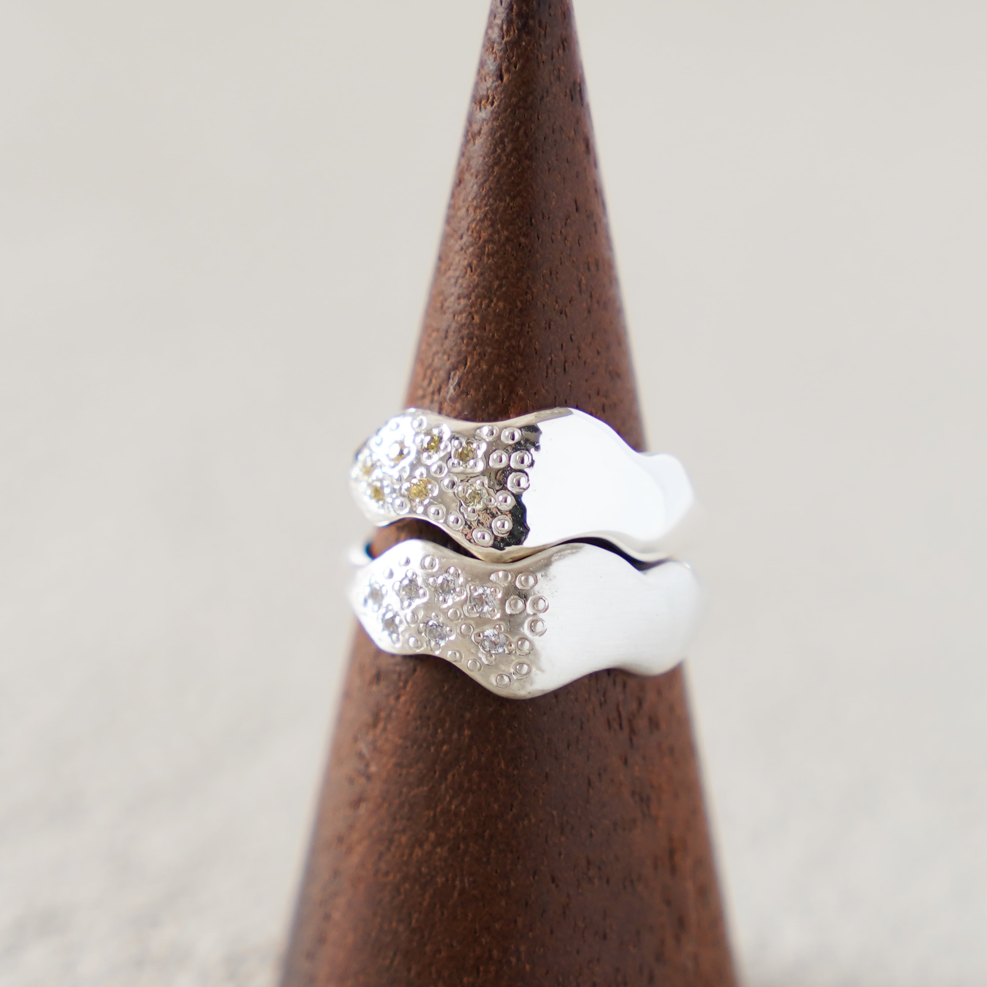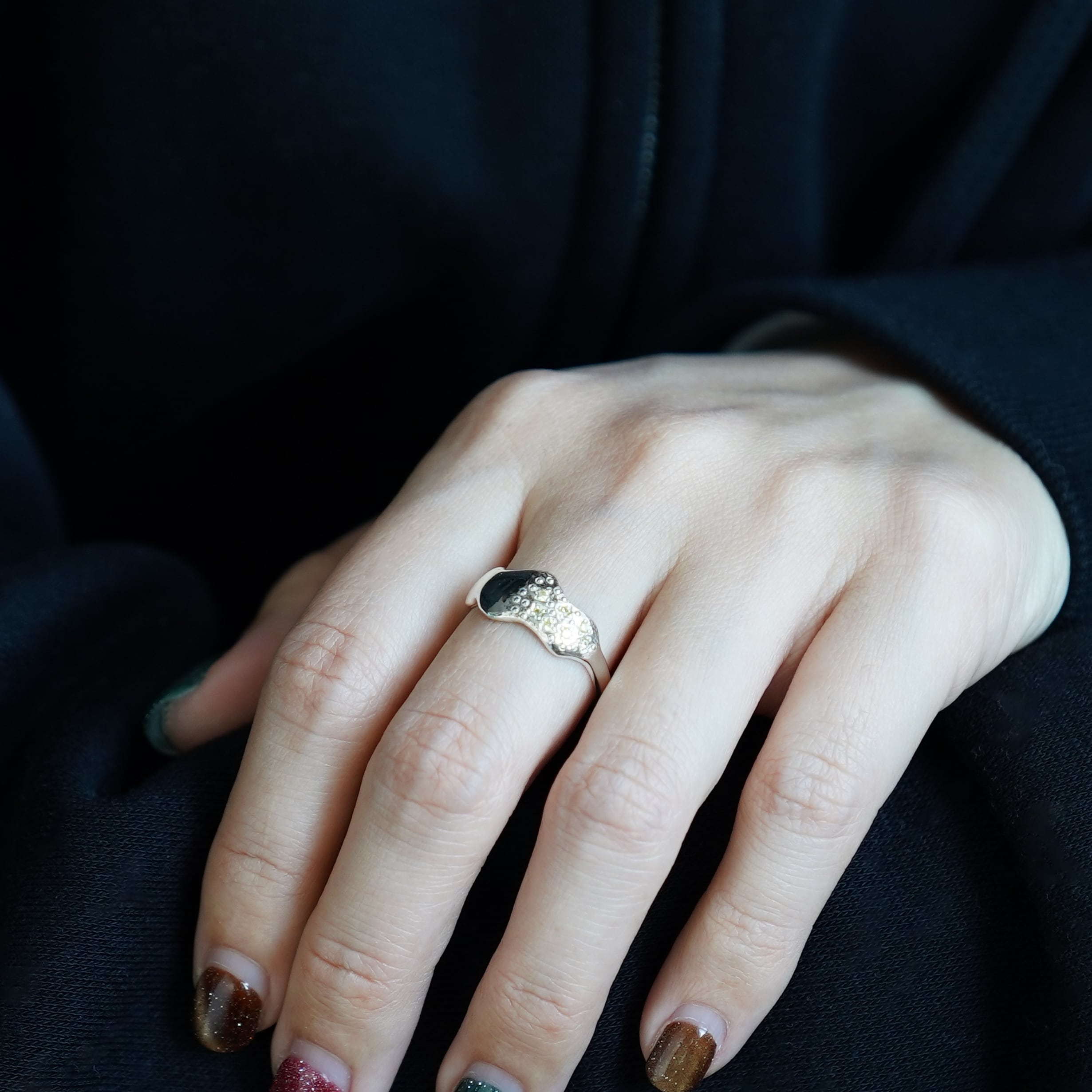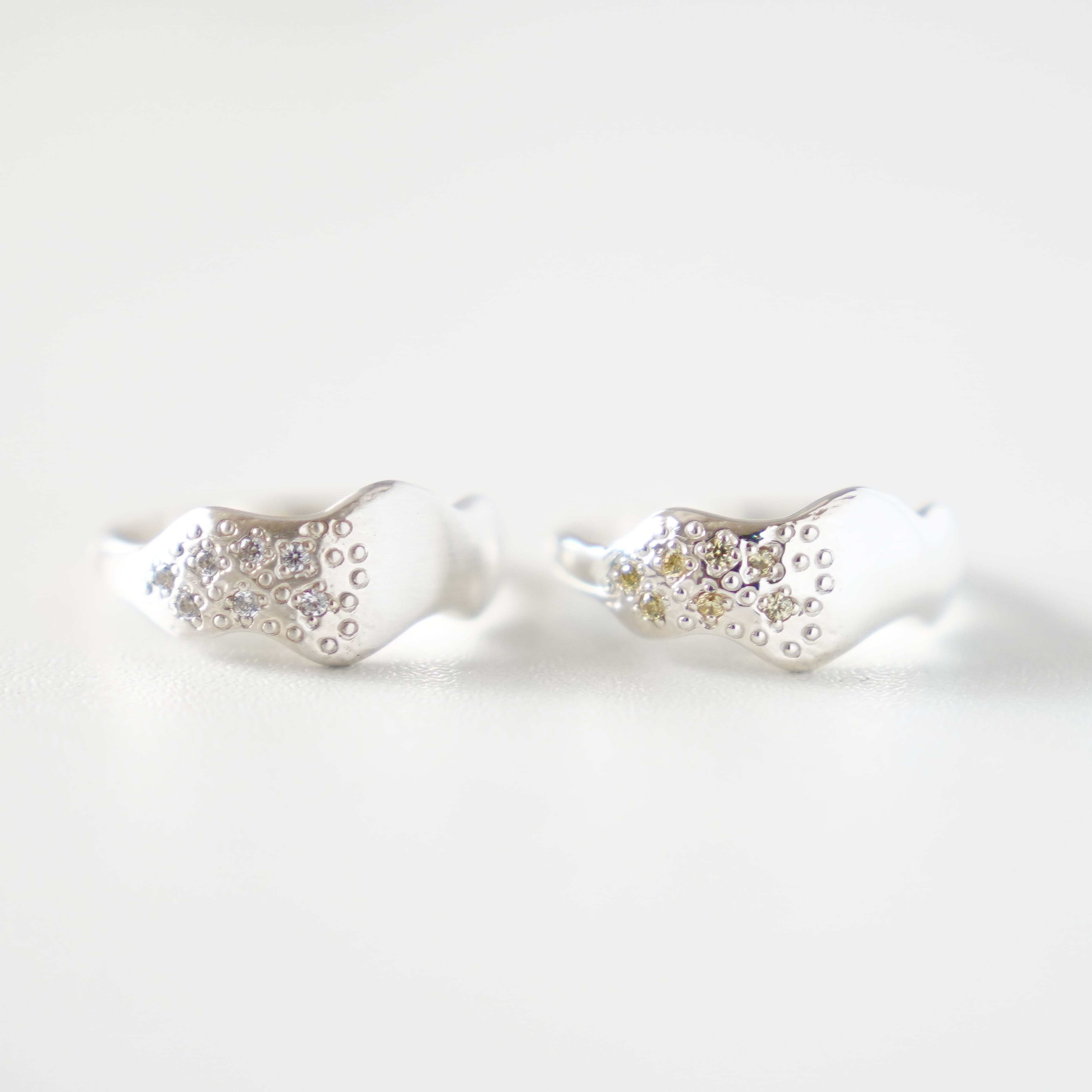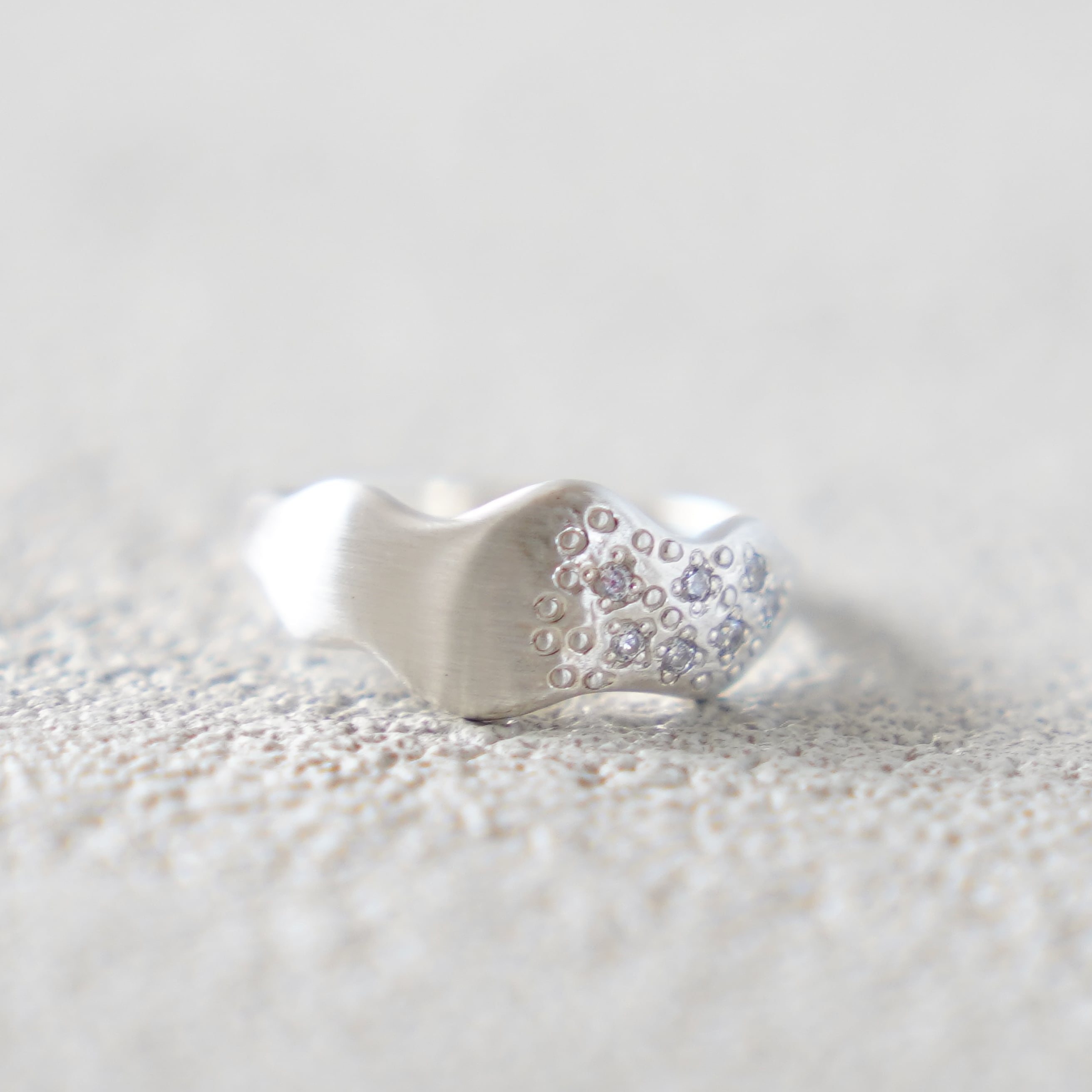 その半分に小粒のキュービックジルコニア7石とドットデザインを散りばめました。