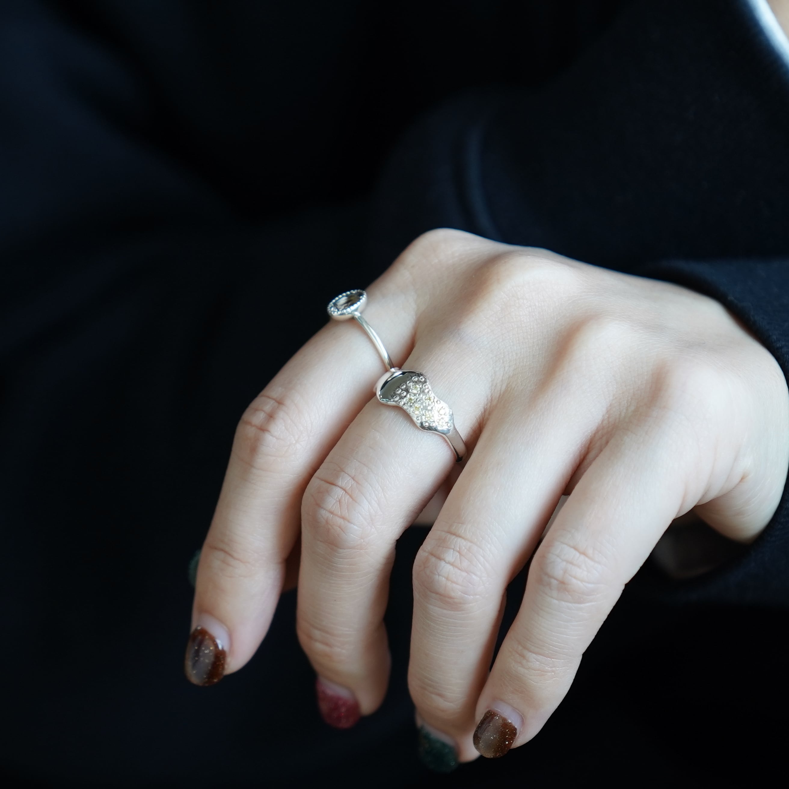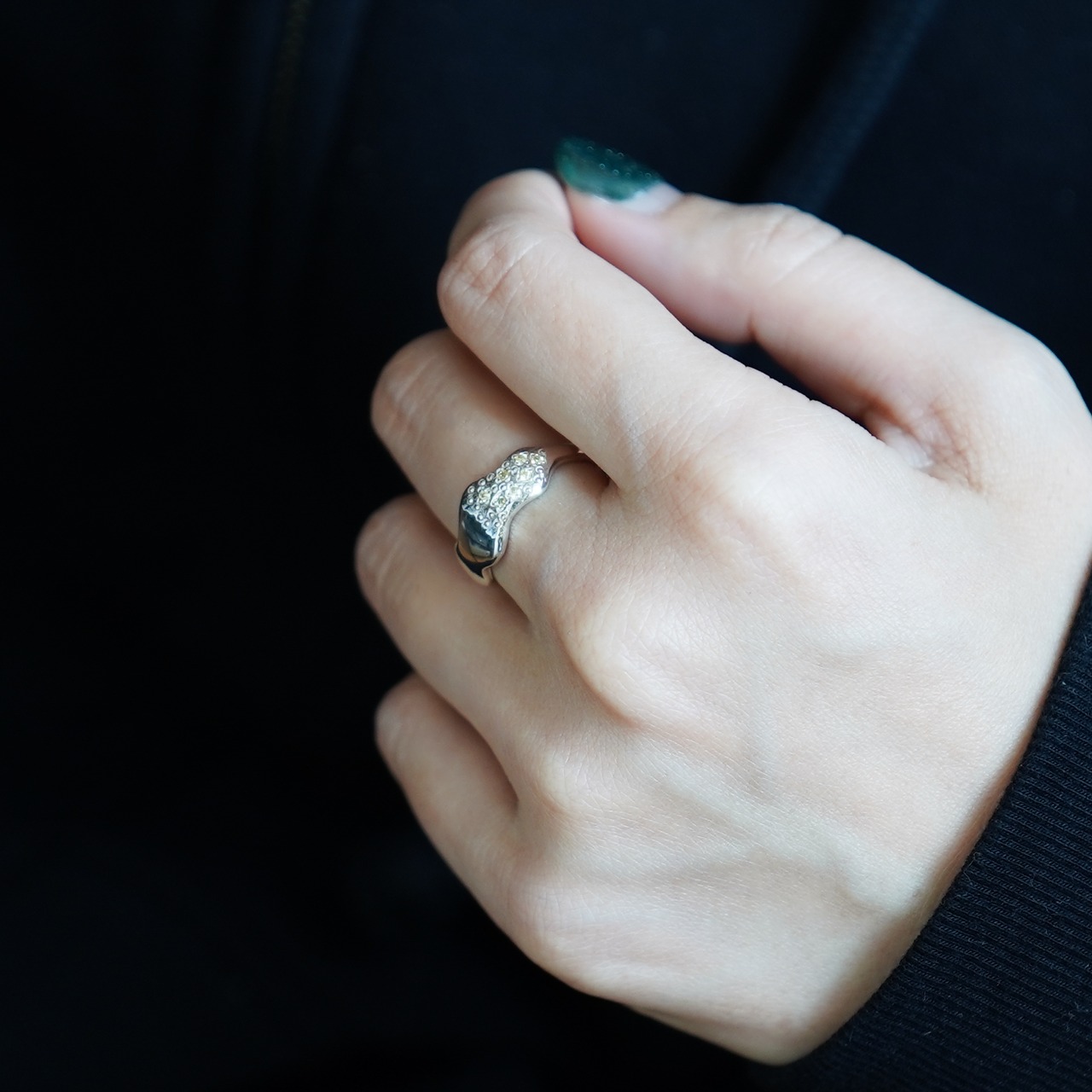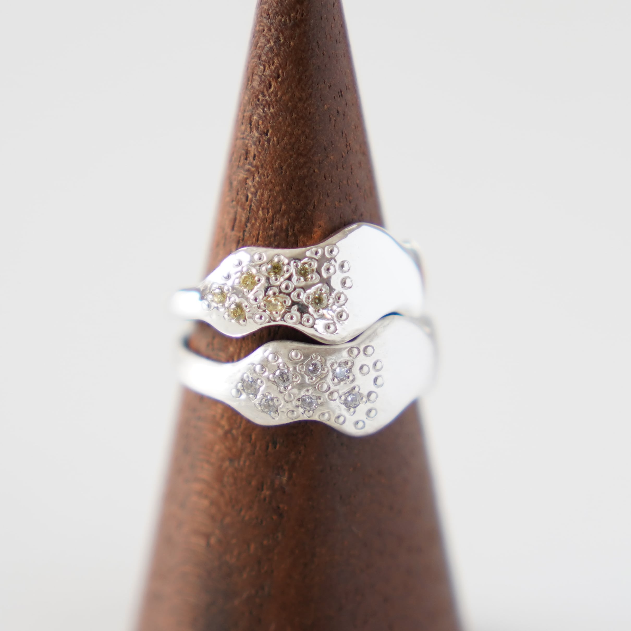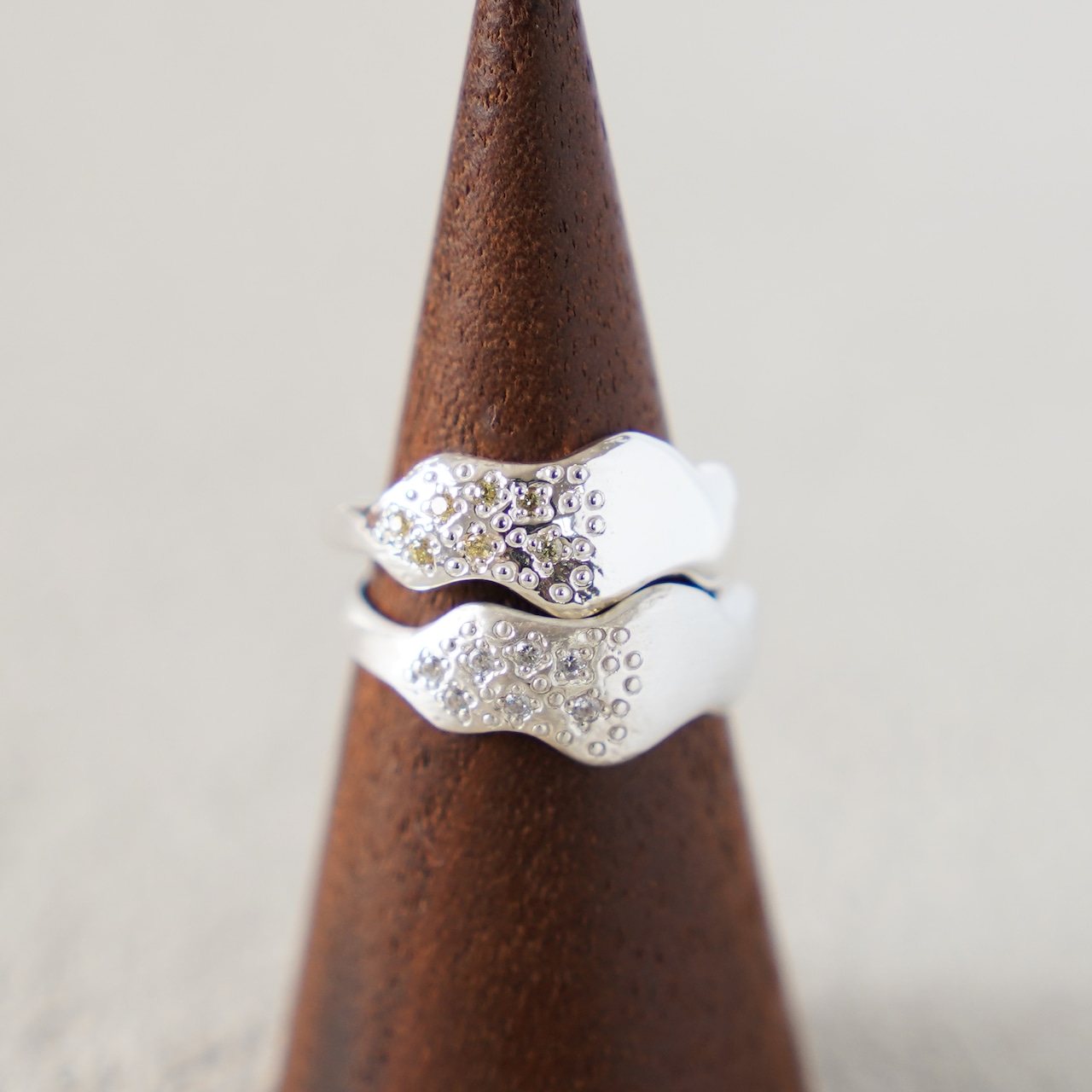 その半分に小粒のキュービックジルコニア7石とドットデザインを散りばめました。